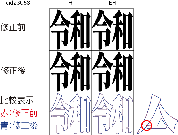 黎ミンのウエイトH/EHのみ令和合字の『令』のアウトライン修正があります。
