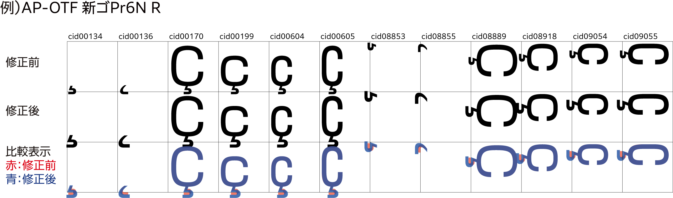 画像は一例です。各書体の対象グリフや修正内容は下記PDFをご覧ください。